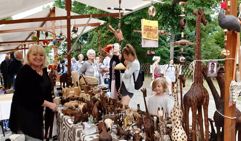 Der bereits traditionelle Wandlitzer Kunstmarkt fand nun erstmals als Open Air Veranstaltung im alten Dorf in Wandlitz statt. Von 10 bis 18 Uhr spazierten am Sonntag, dem 1. August bei idealem Wetter viele Besucher über den Markt und interessierten sich auch für die von den San hergestellten Schnitzereien und Korbwaren und das Projekt Ombili.