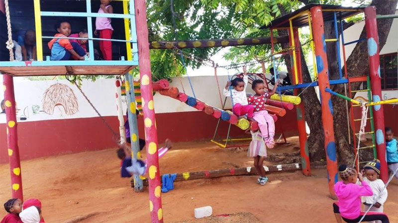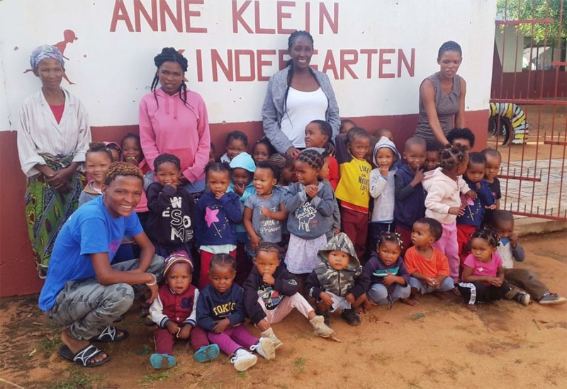 | Sorgfältig betreut von San-Kindergärtnerinnen und hier auch mit einem Kindergärtner bei den kleinen San der Ombili-Stiftung auf Farm Hedwigslust im Bezirk Tsumeb. Fotos Giesela Wieckhorst | 20 Jahre gefördert und gut erhalten, reges Leben im Anne Klein Kindergarten. |