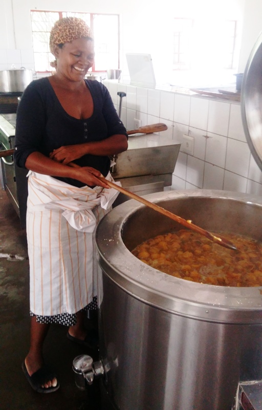 Am nächsten Tag köchelt schon die erste “Portion” Marmelade im großen Kessel. Die Köchin ist Loide Kambuta. Wenn sie nicht in der Küche arbeitet, dann leitet sie einen Teil des Gemeindechores. Vor wenigen Wochen hat sie aus traurigem Anlass vier Kinder aus ihrem Familienkreis adoptiert.