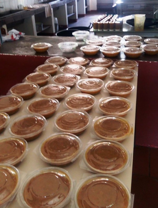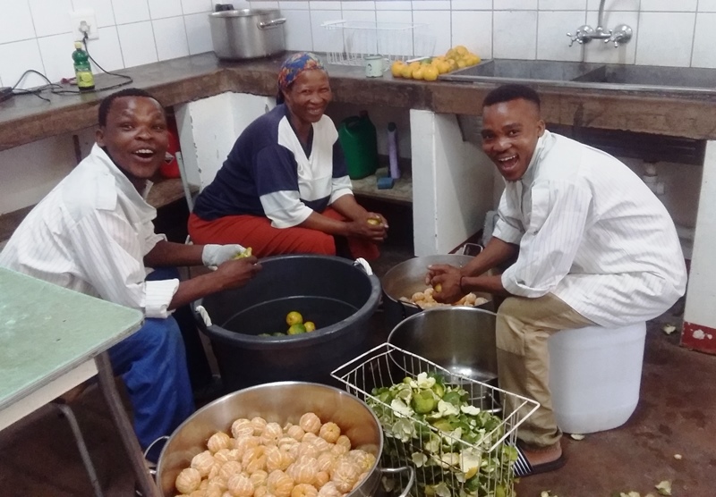 Während draußen wieder einmal ein wahrer Sturzregen vom Himmel fällt und unsere Werkstattarbeiter vom Baumschnitt abhält (li. Sakaria Asser und Mitte Phillipus Dweb*), beginnt wie geplant nun am Montag, die Produktion der Marmelade.