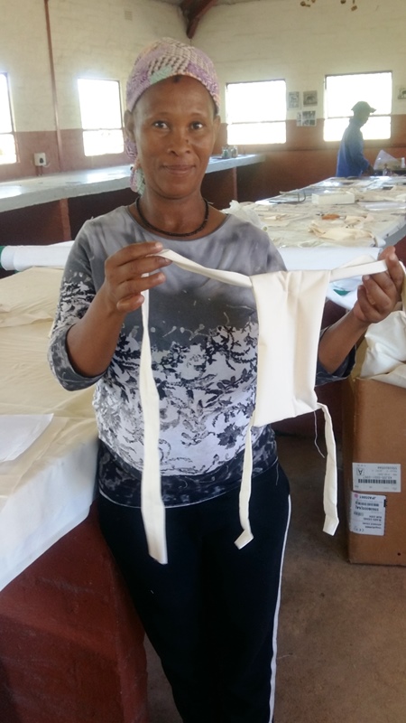 In der Nähwerkstatt hat Regina Erastus den ersten Prototyp eines Behelfsmundschutzes hergestellt. Im Handel war alles wie leer gefegt. Stoffe gibt es aber aus unserer Containerlieferung aus dem Jahr 2014 noch reichlich.