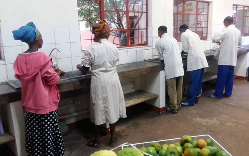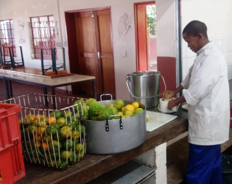 Nach dem Früchtewaschen werden die Mandarinen geschält. Parallel dazu presst Hiskia Jakob der Küchenchef einige wenige der verbliebenen Zitronen aus.